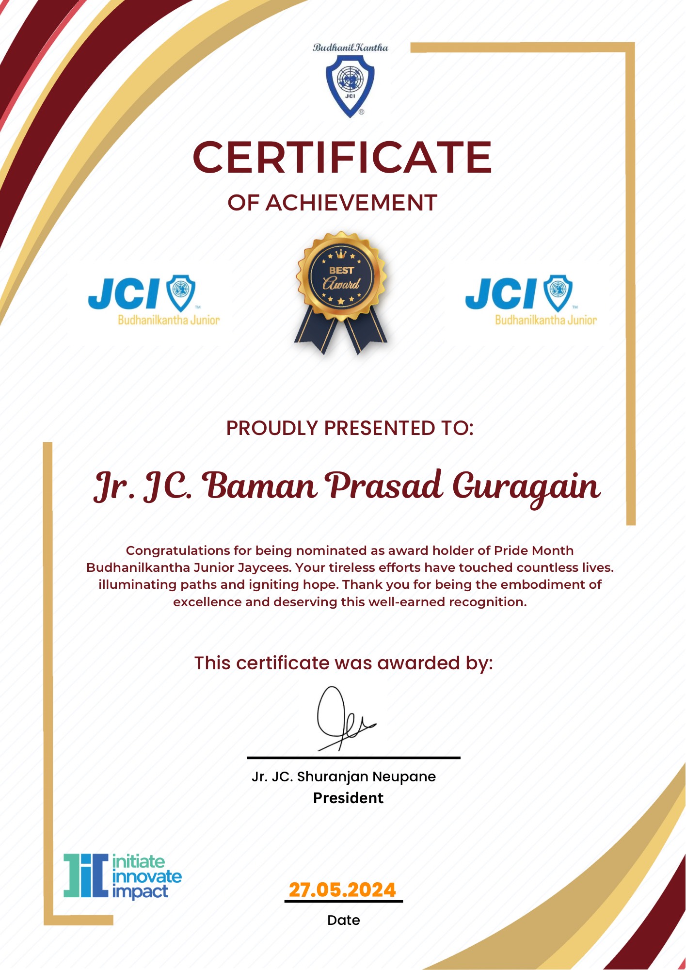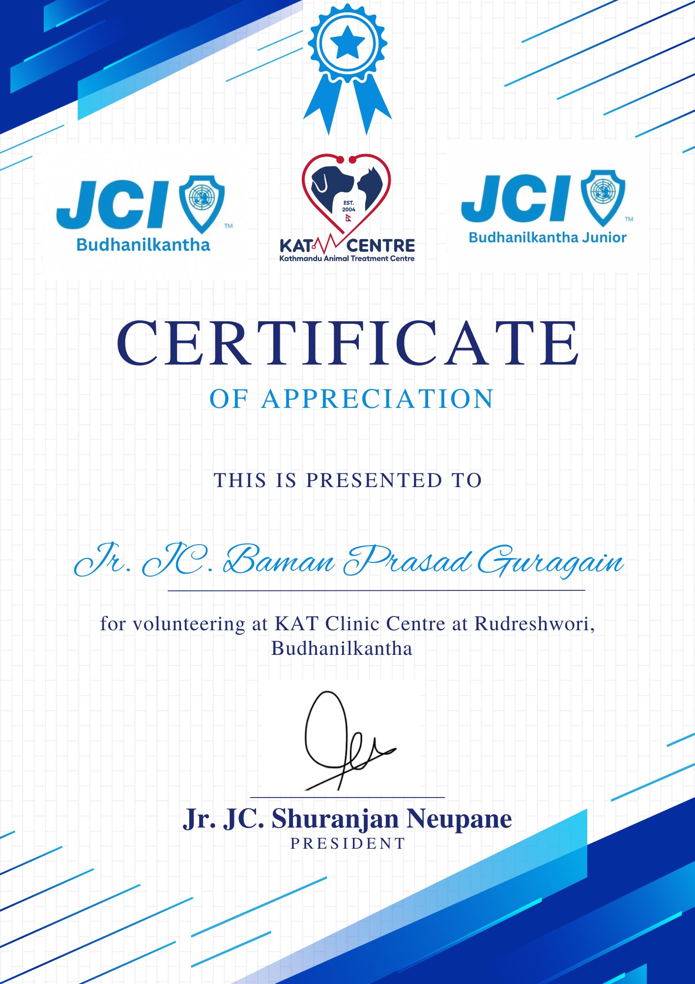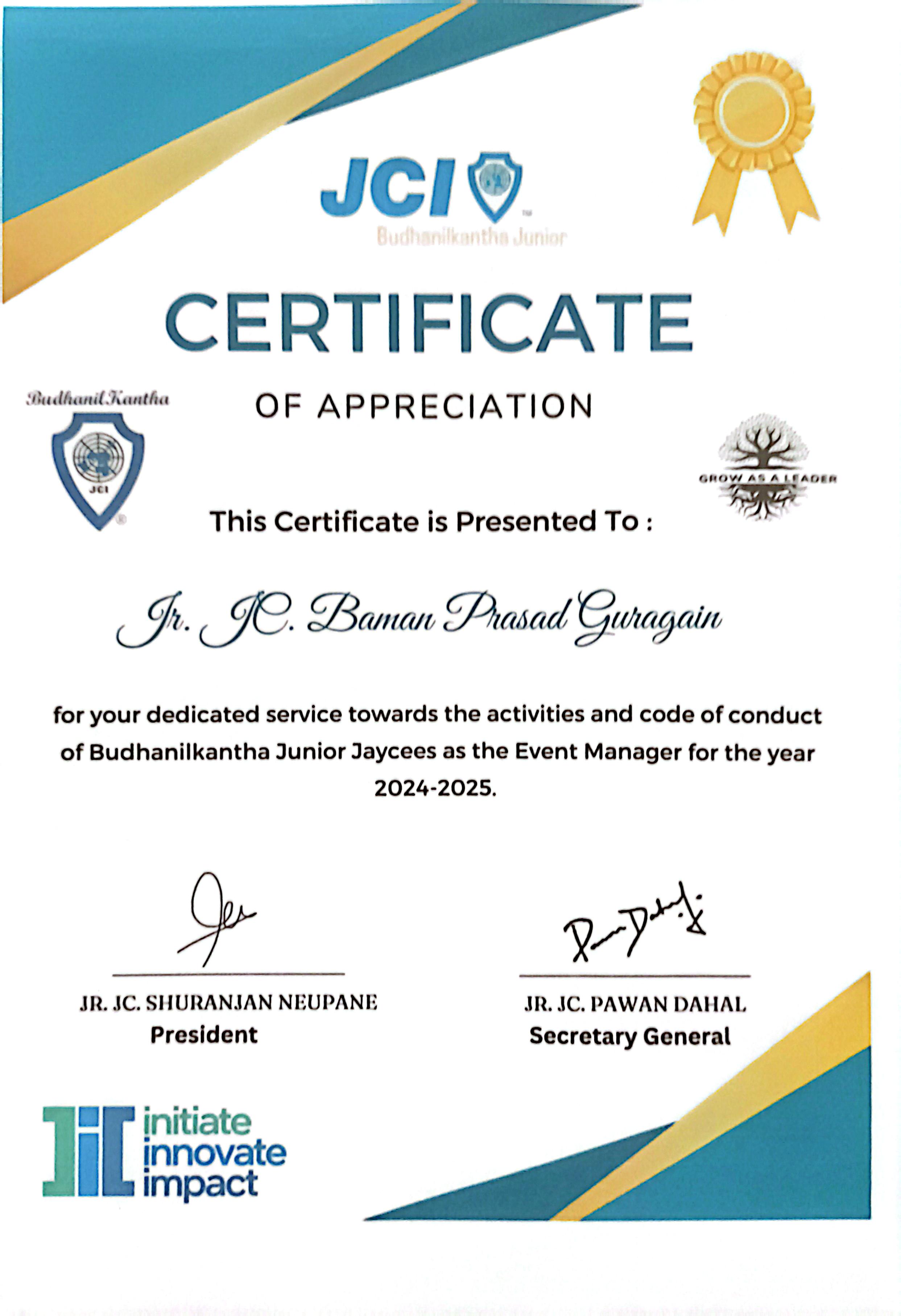 Received certificate of appreciation for serving as Event Manager at Budanilkantha Junior Jaycees.