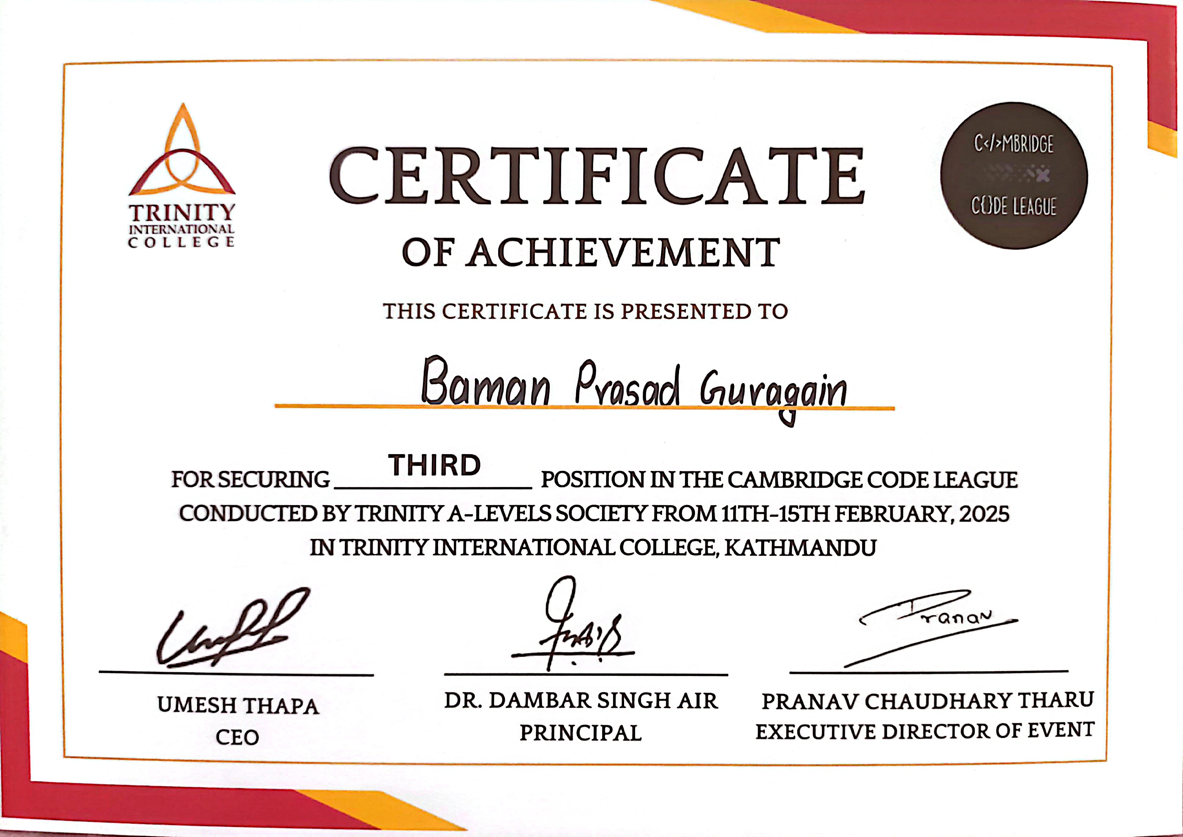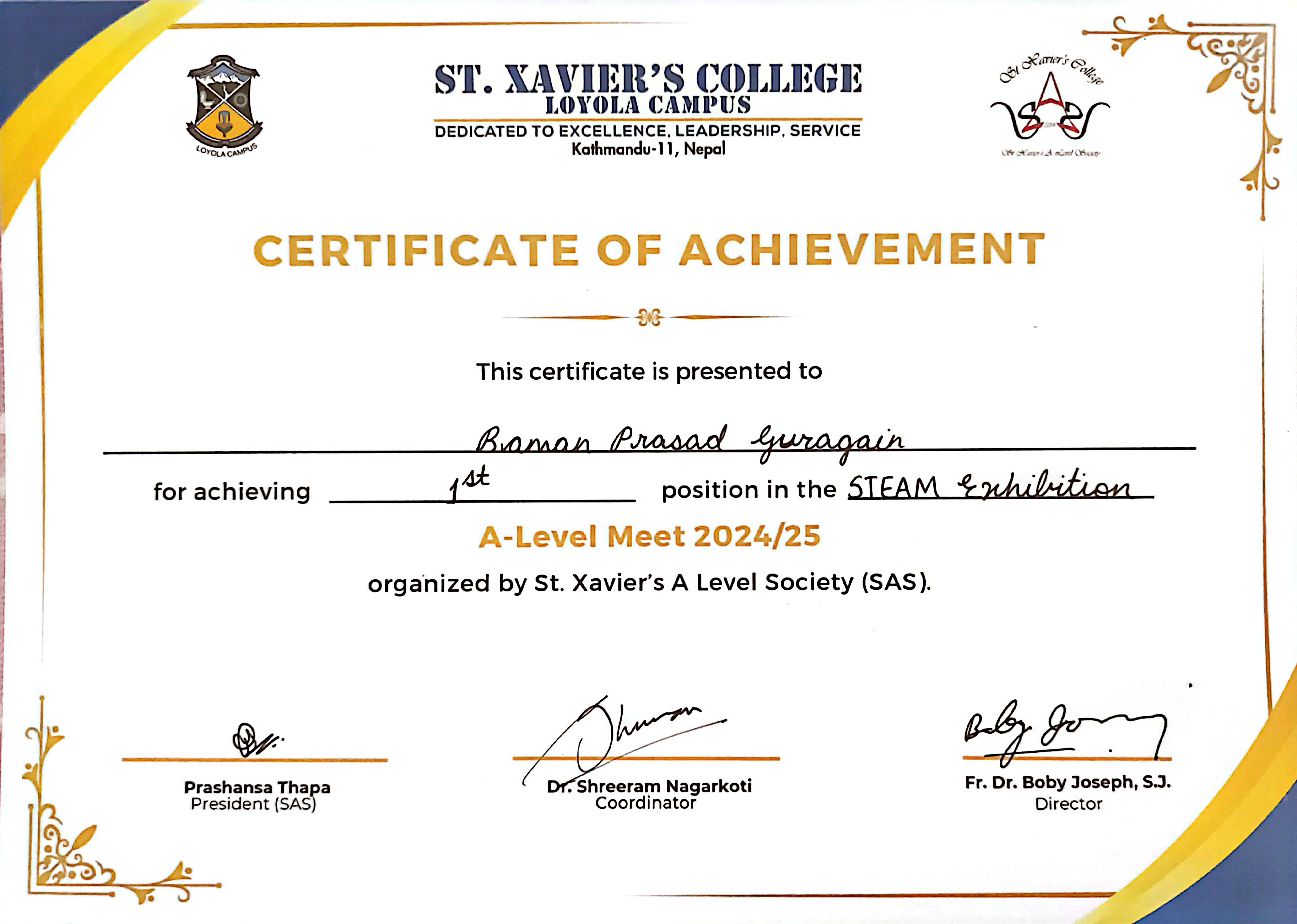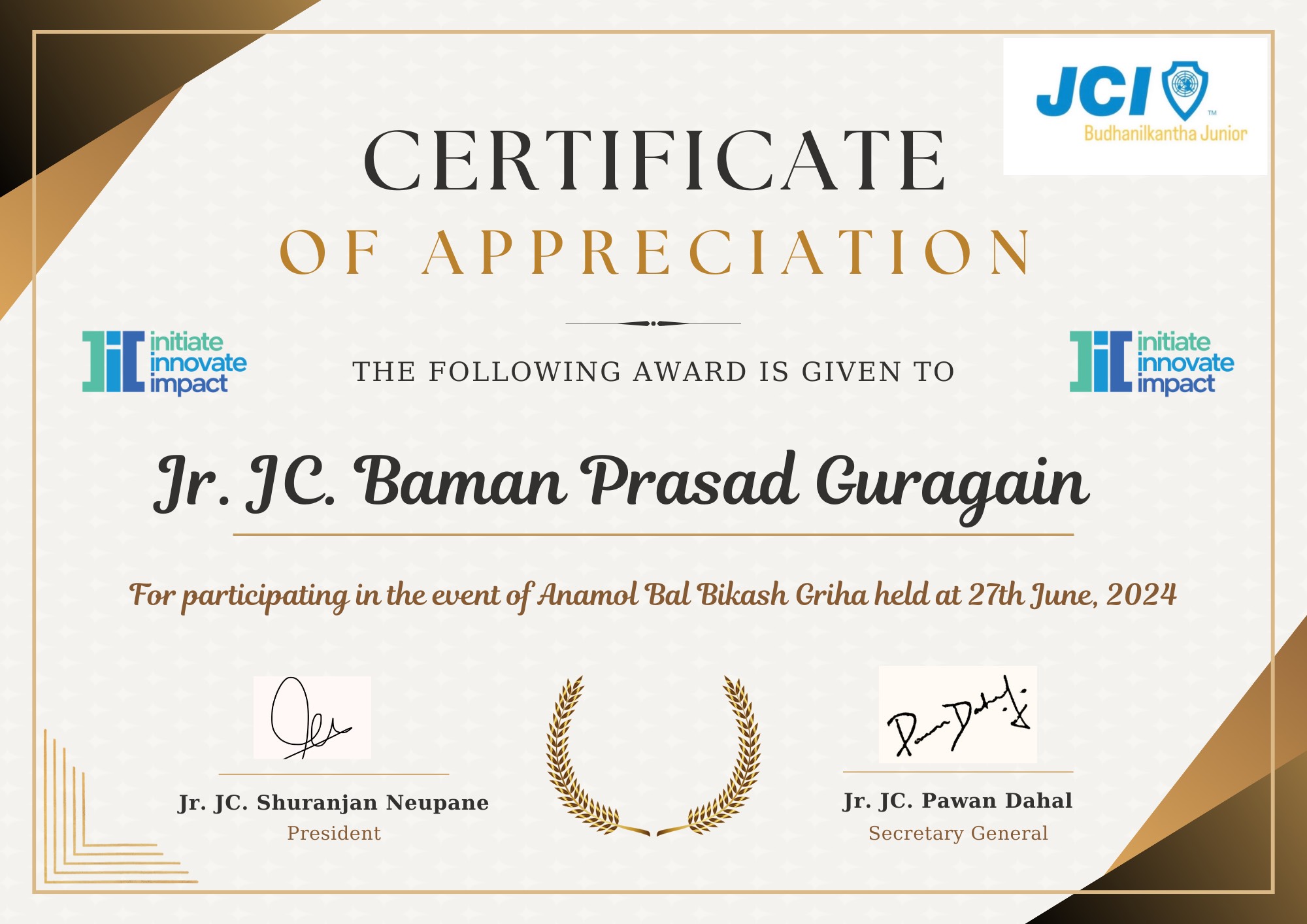 Received certificate of appreciation for serving as Event Manager at Budanilkantha Junior Jaycees.