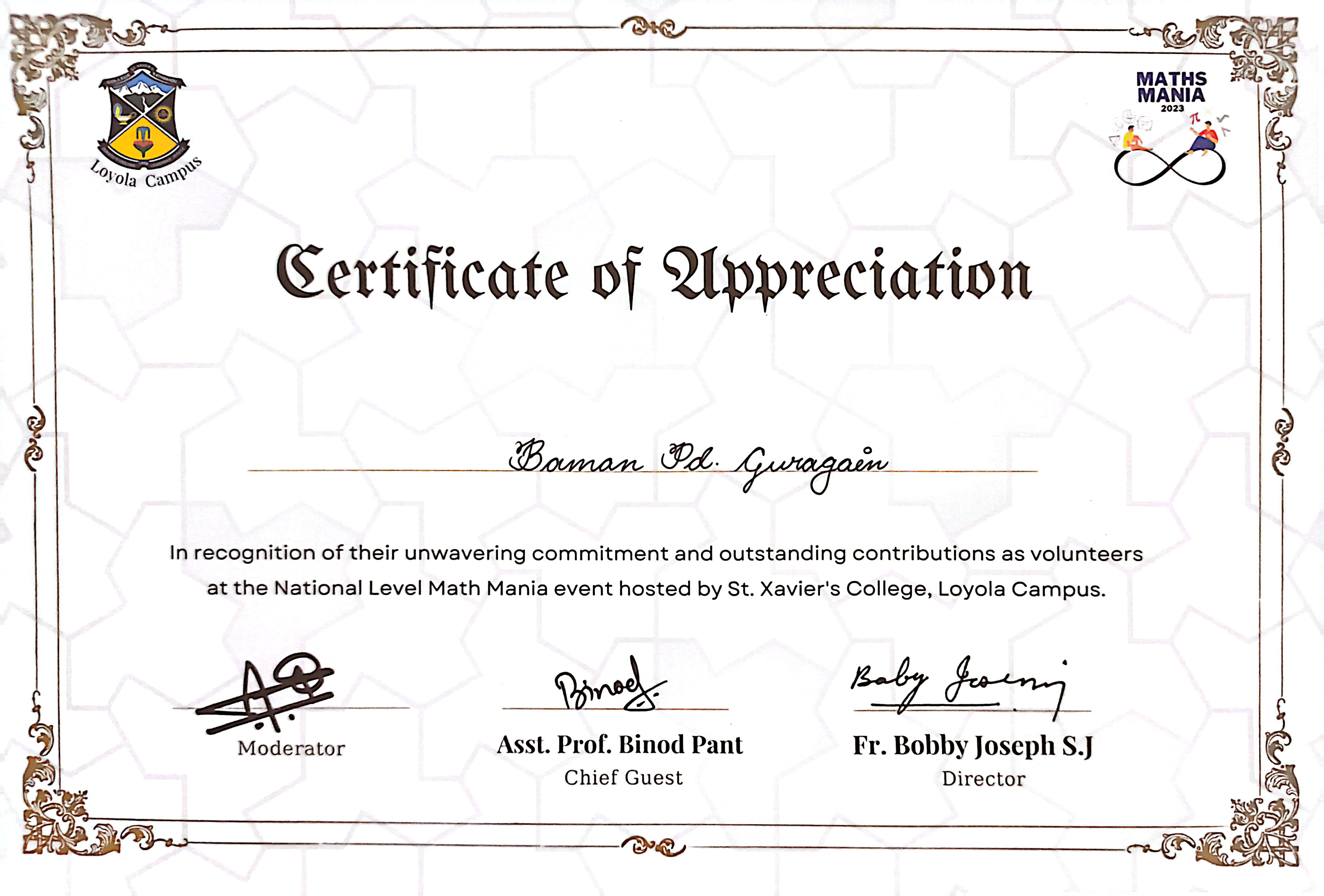 Received certificate of appreciation for organising Math Mania 2023.