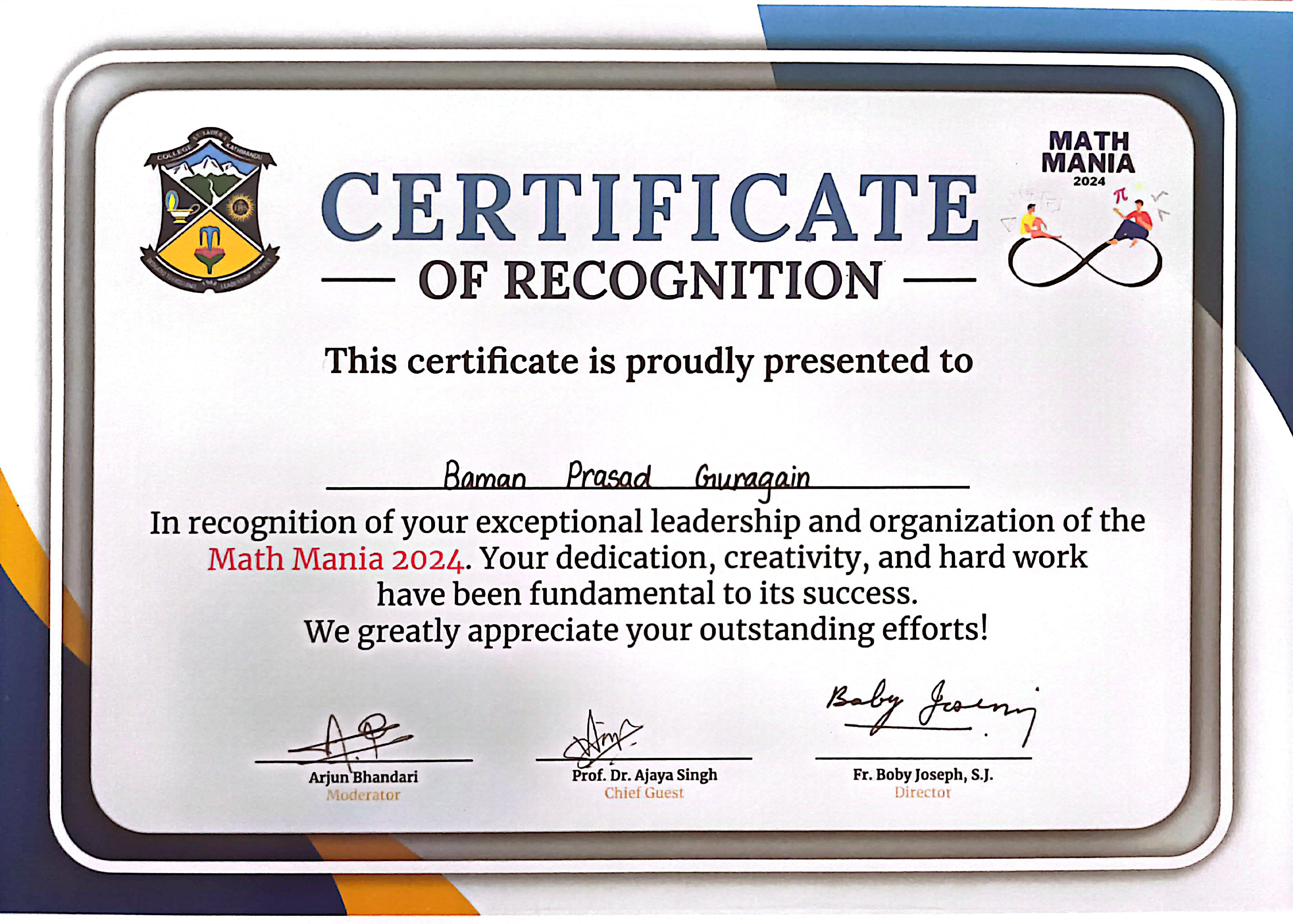 Received certificate of recognition for organising Math Mania 2024.