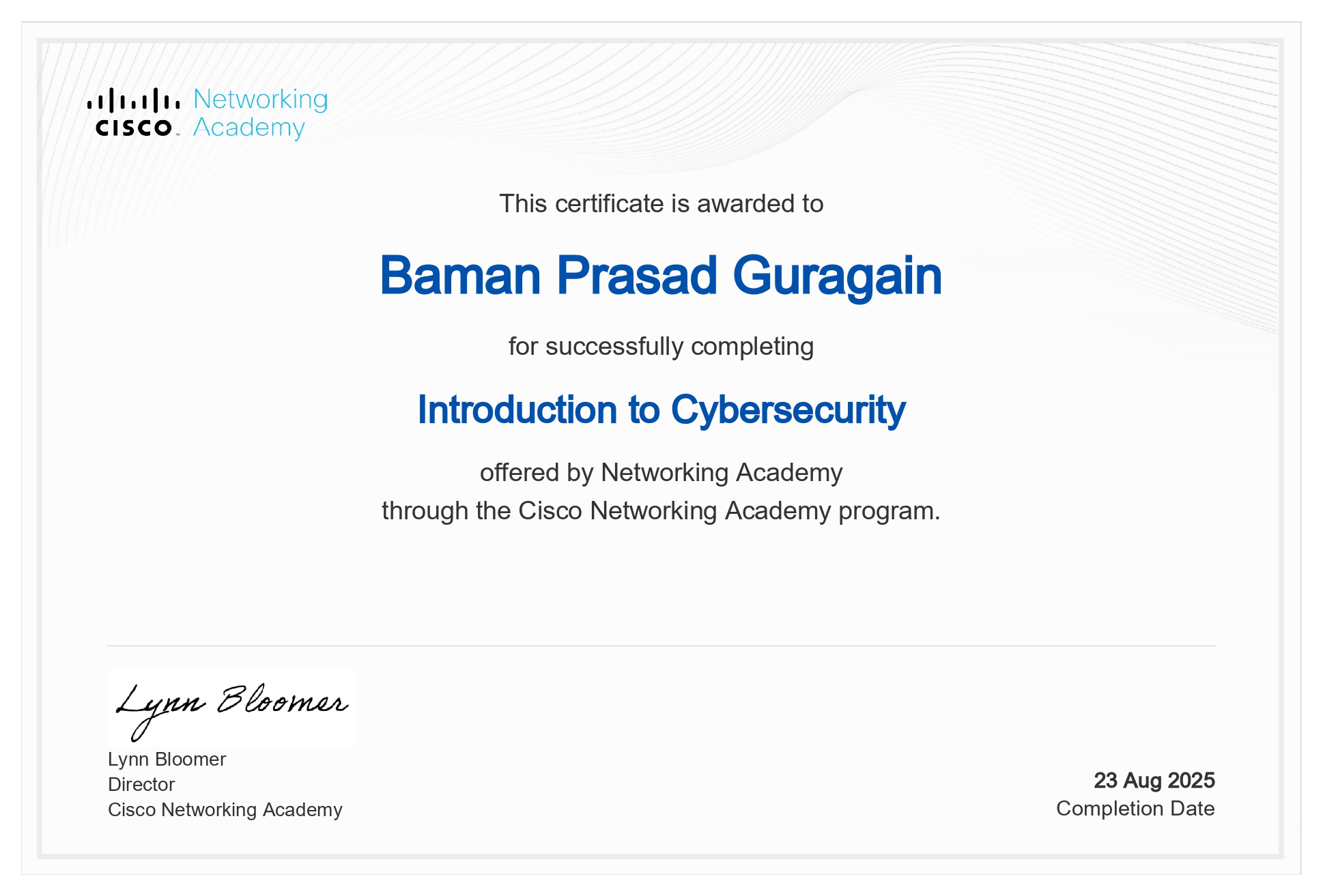 Completed Cisco Introduction to Cybersecurity course covering essential security concepts and threat landscape.
