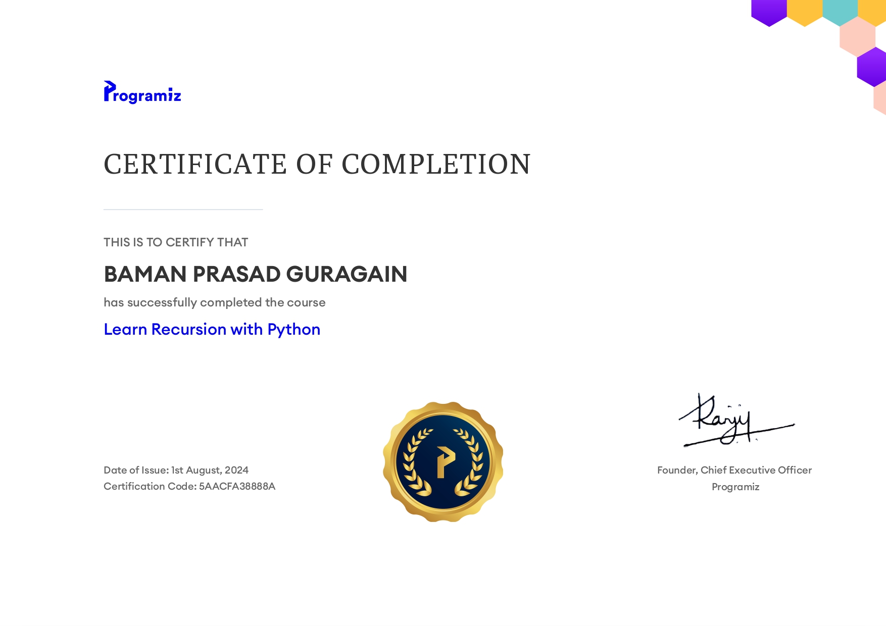 Completed Learn Recursion with Python course covering recursive programming concepts.