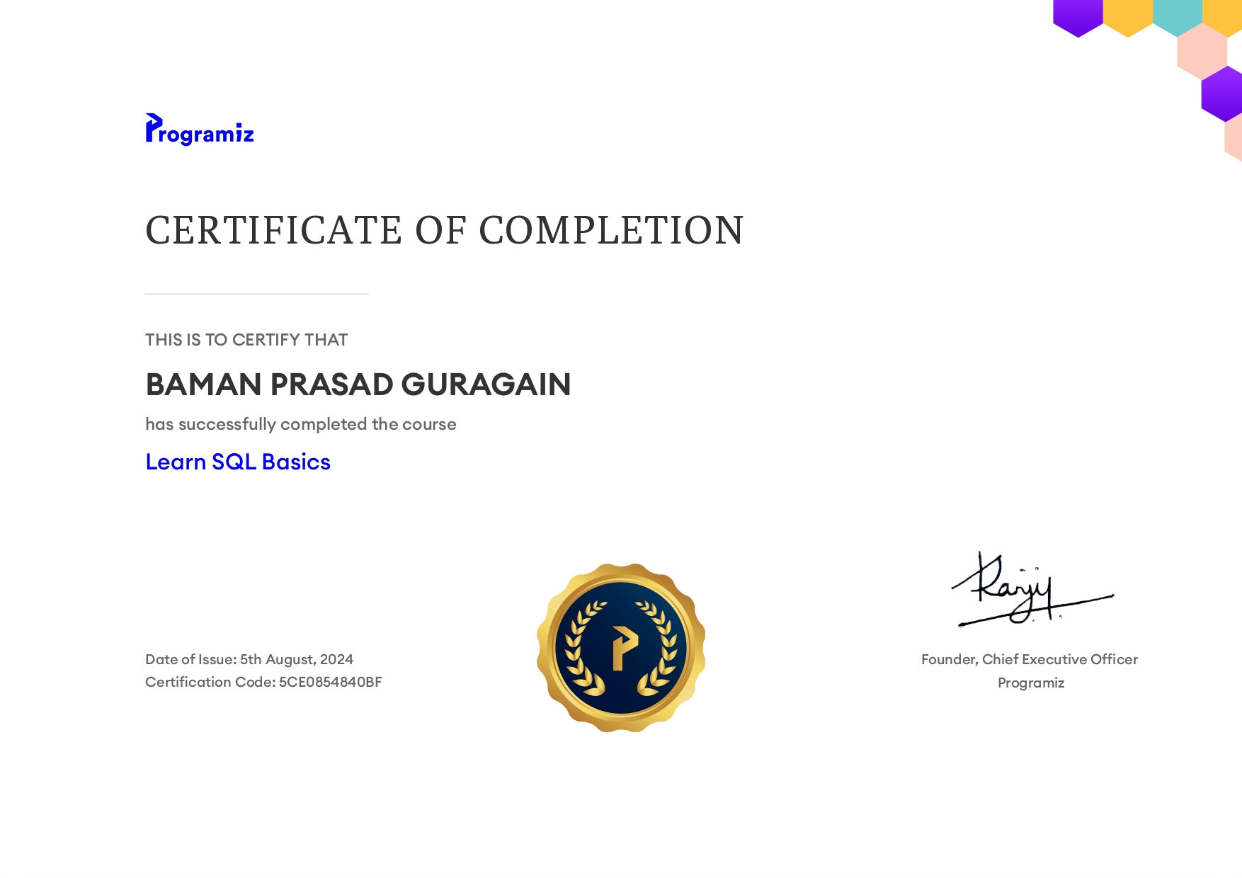 Completed Learn SQL Basics course covering fundamental database queries and operations.