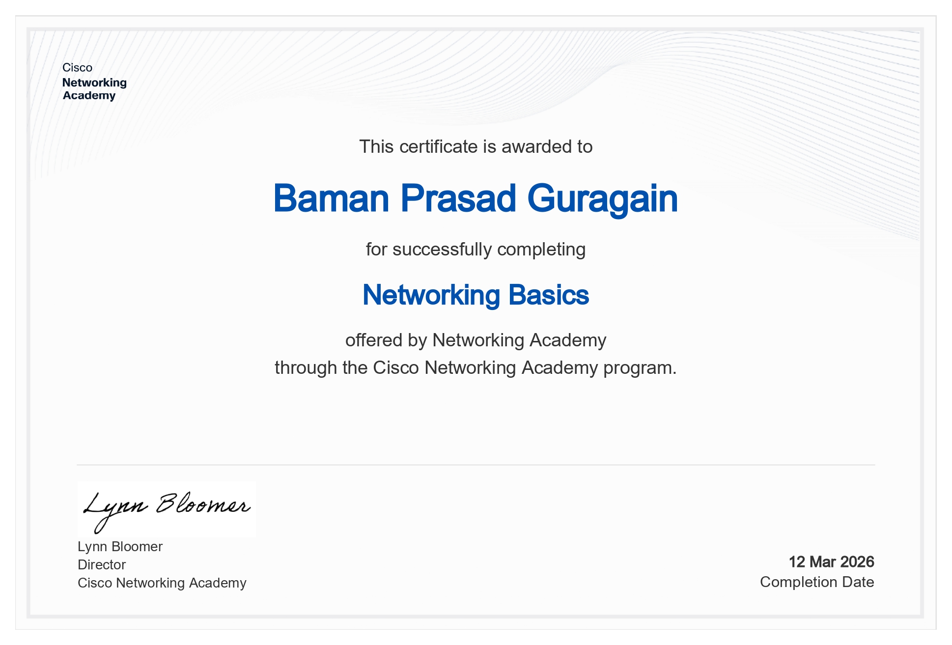Completed Cisco Networking Basics course covering fundamental networking concepts, protocols, and infrastructure.